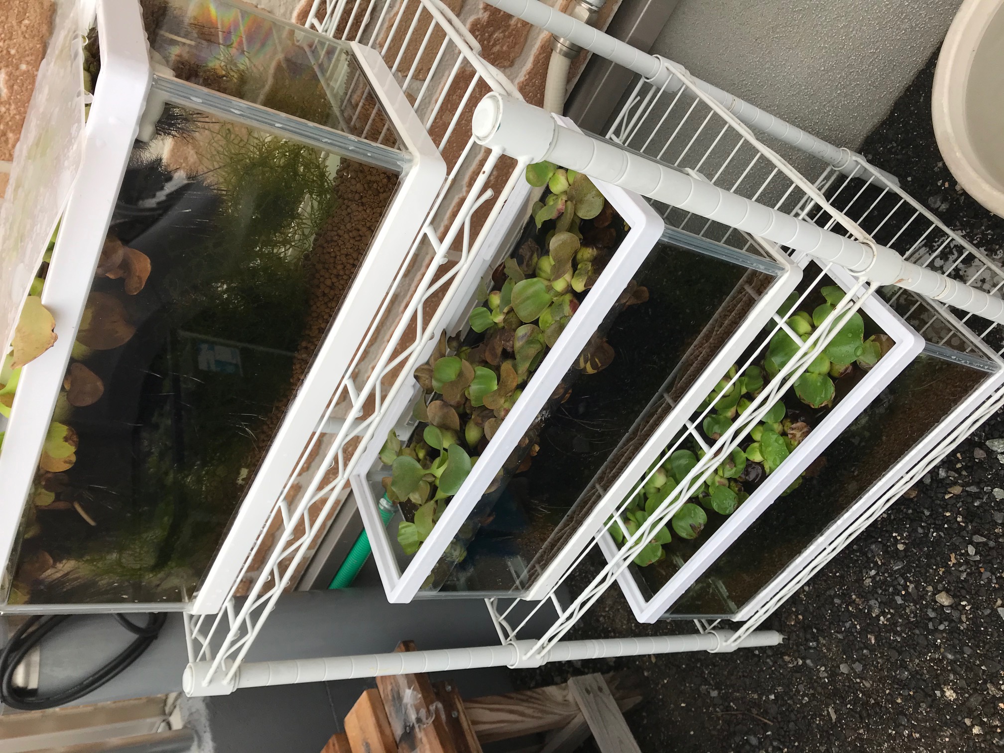 屋外水槽は、2代目と3代目メダカが元気よく泳いで